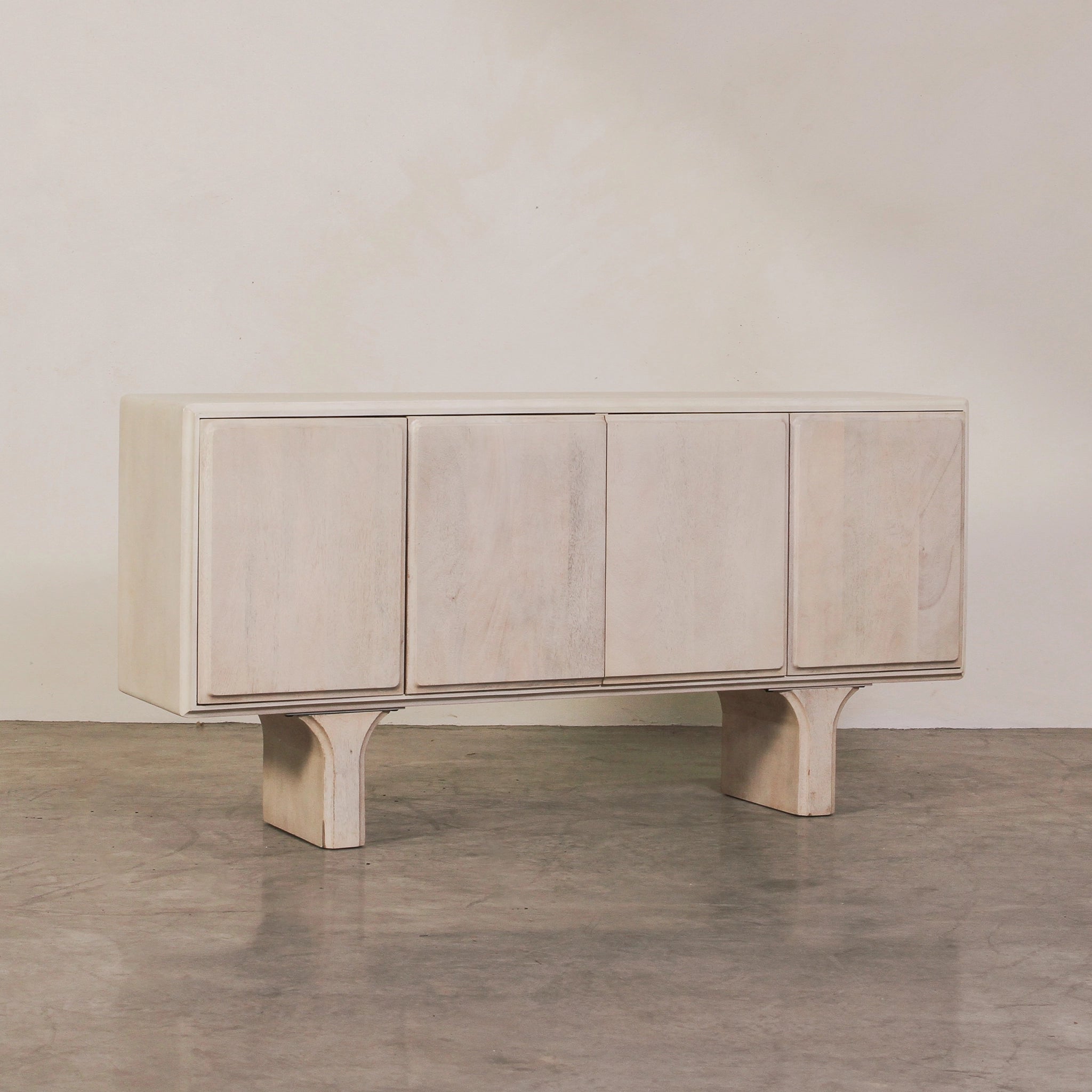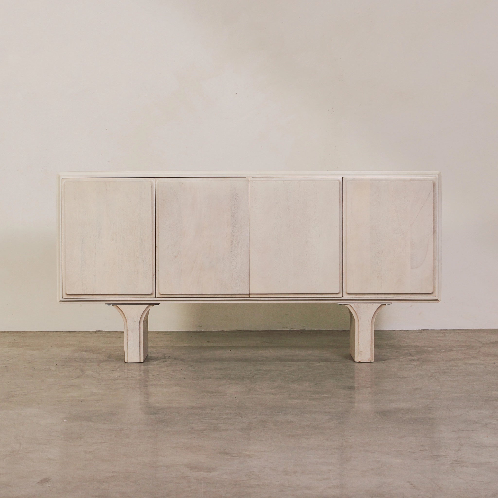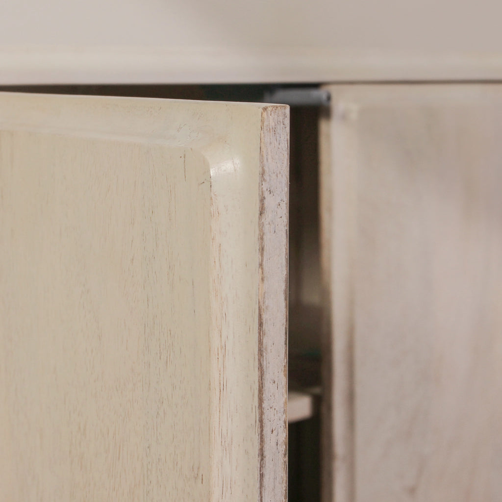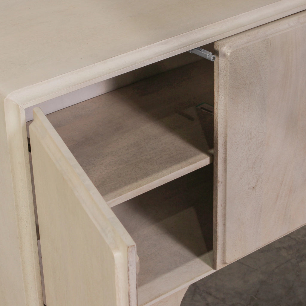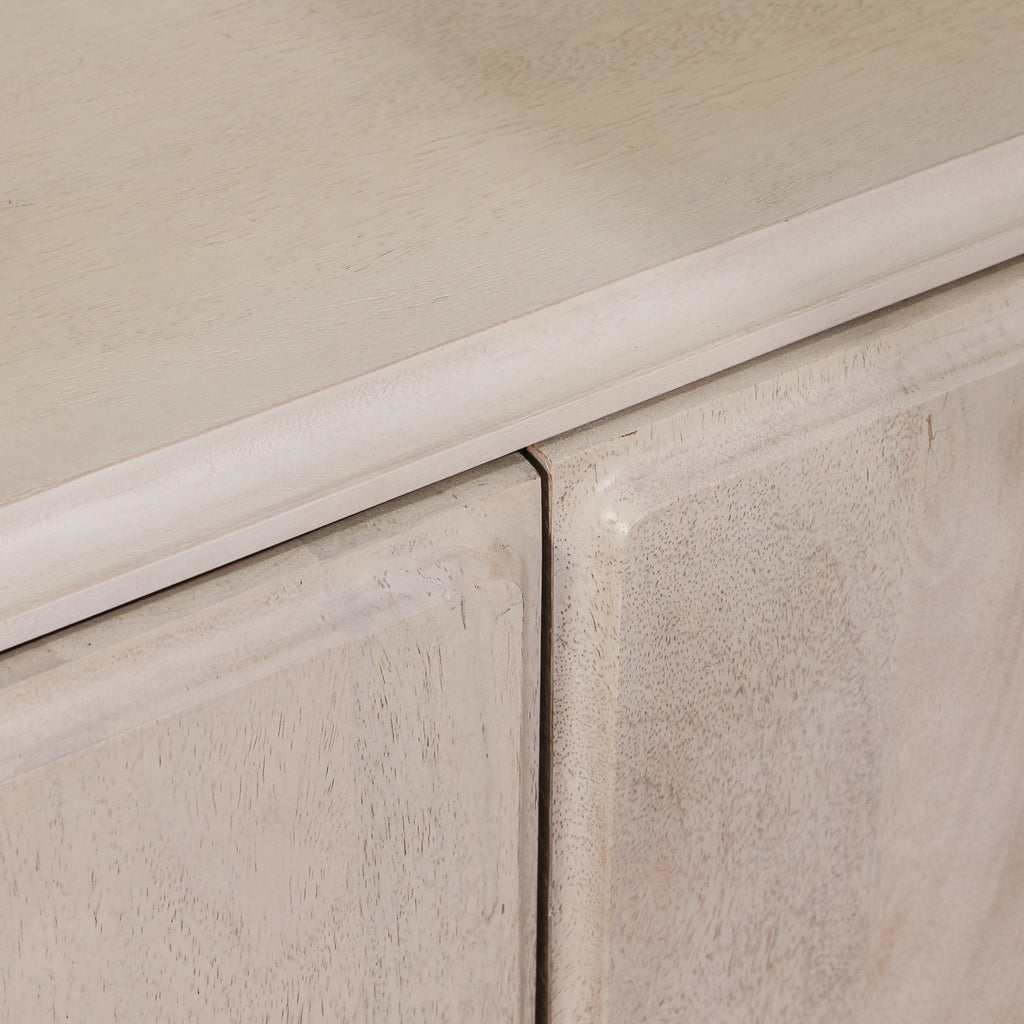 The Strand Sideboard is the perfect console for almost every home. Constructed from premium mango wood, this sideboard is given a white wash finish that exudes a feeling of relaxed elegance. With its minimal design and simple block legs, it's proportions bring a balanced and sophisticated style to any space. The sideboard offers four doors of concealed storage space and has a spacious table top for displaying art, lamps, decor and more.