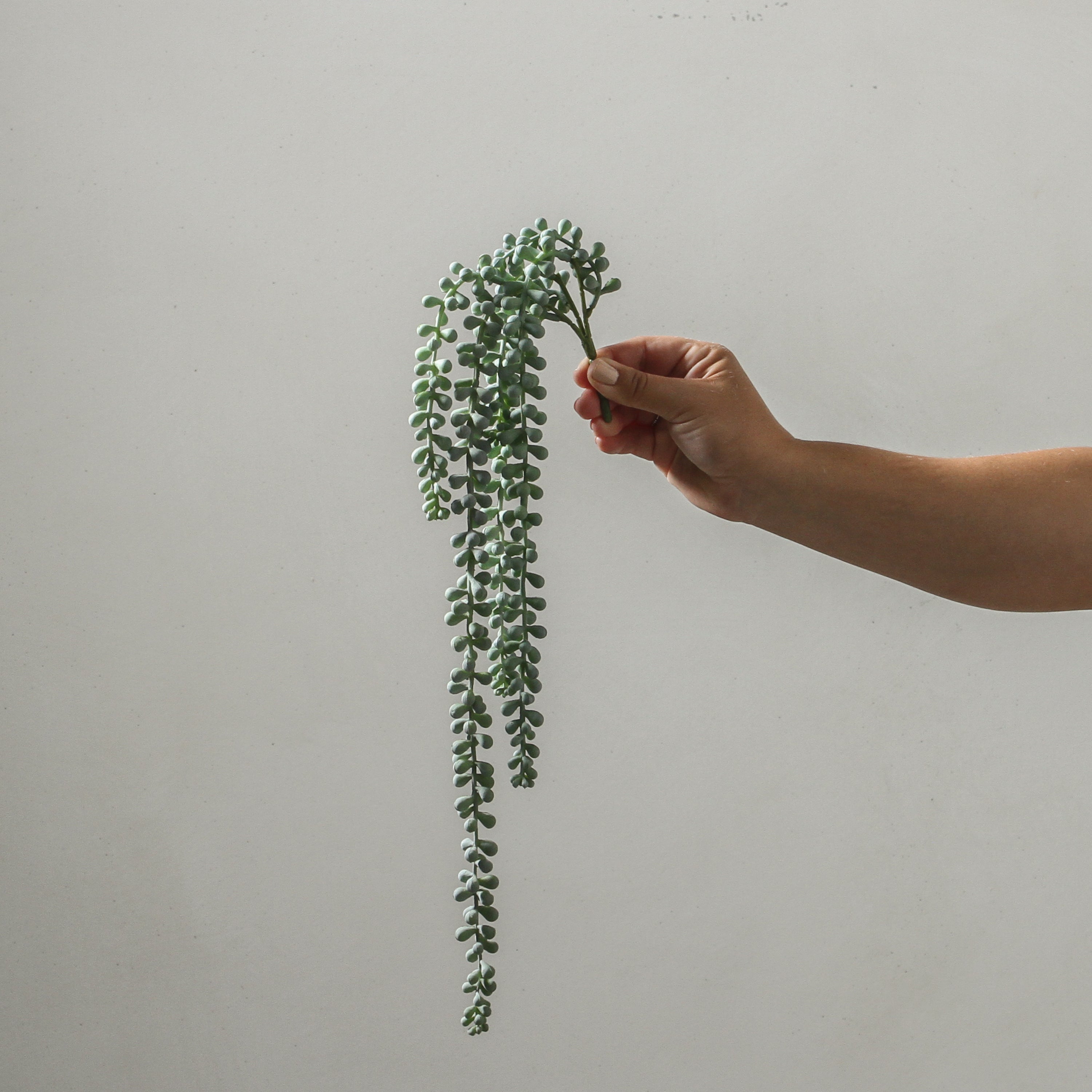 Bring the garden in and create an indoor oasis using this remarkably realistic string of pearls hanging bush. Easily styled mixing with other plants and bushes from our vast range of artificial greenery, this string or pearls hanging bush in green will bring lasting beauty.