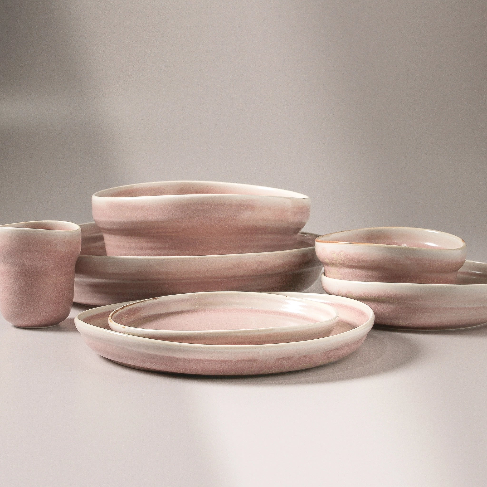 It is bathed in the soft, tranquil shade of dusty pink, providing a gentle backdrop for the captivating reactive glaze. You will find an organic constellation of warming ochre and deep golden-brown speckles dancing across the surface, giving the porcelain a rich, hand-crafted story.