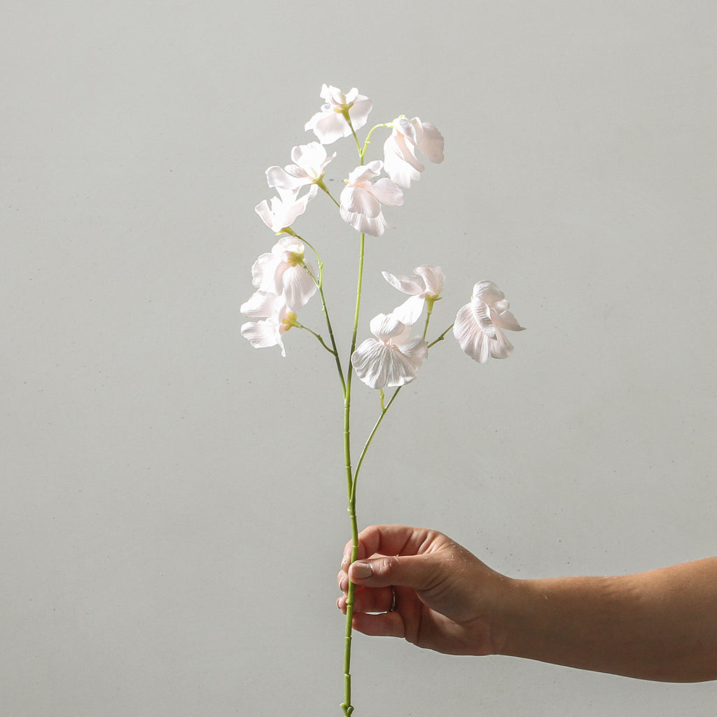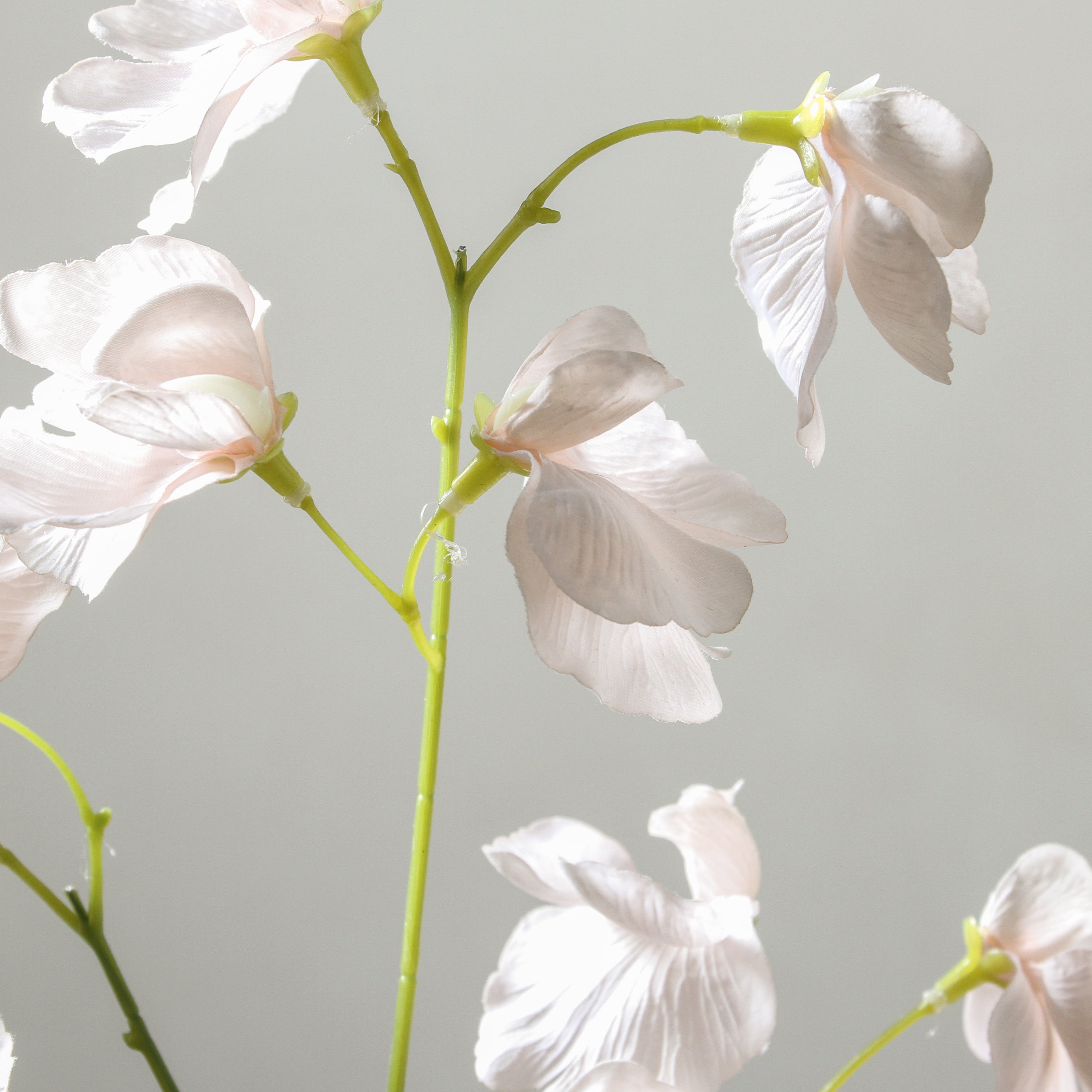 Bring a dash of colour to your interior space with this gorgeous faux sweet pea spray in soft pink. Easily maintained this beautiful artificial flower spray will bring lasting beauty into your home. Create a one of a kind artificial arrangement mixing this sweet pea with other sprays or place in a decorative vase on its own. For longer lasting faux flower sprays keep out of direct sunlight