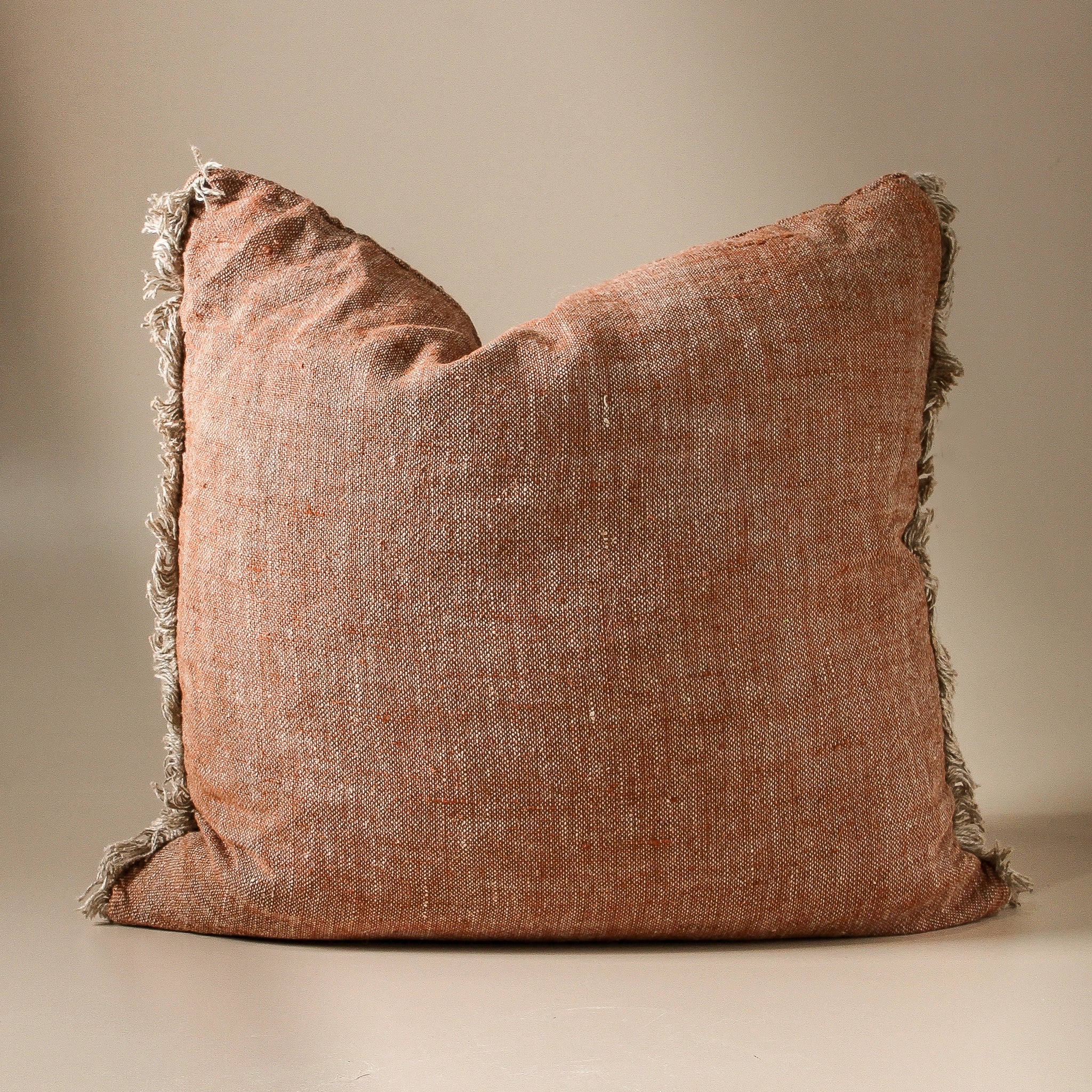 Crafted on a traditional handloom and accented with natural fringing on the short sides, this cushion combines rustic elegance with a luxurious heavyweight feel.