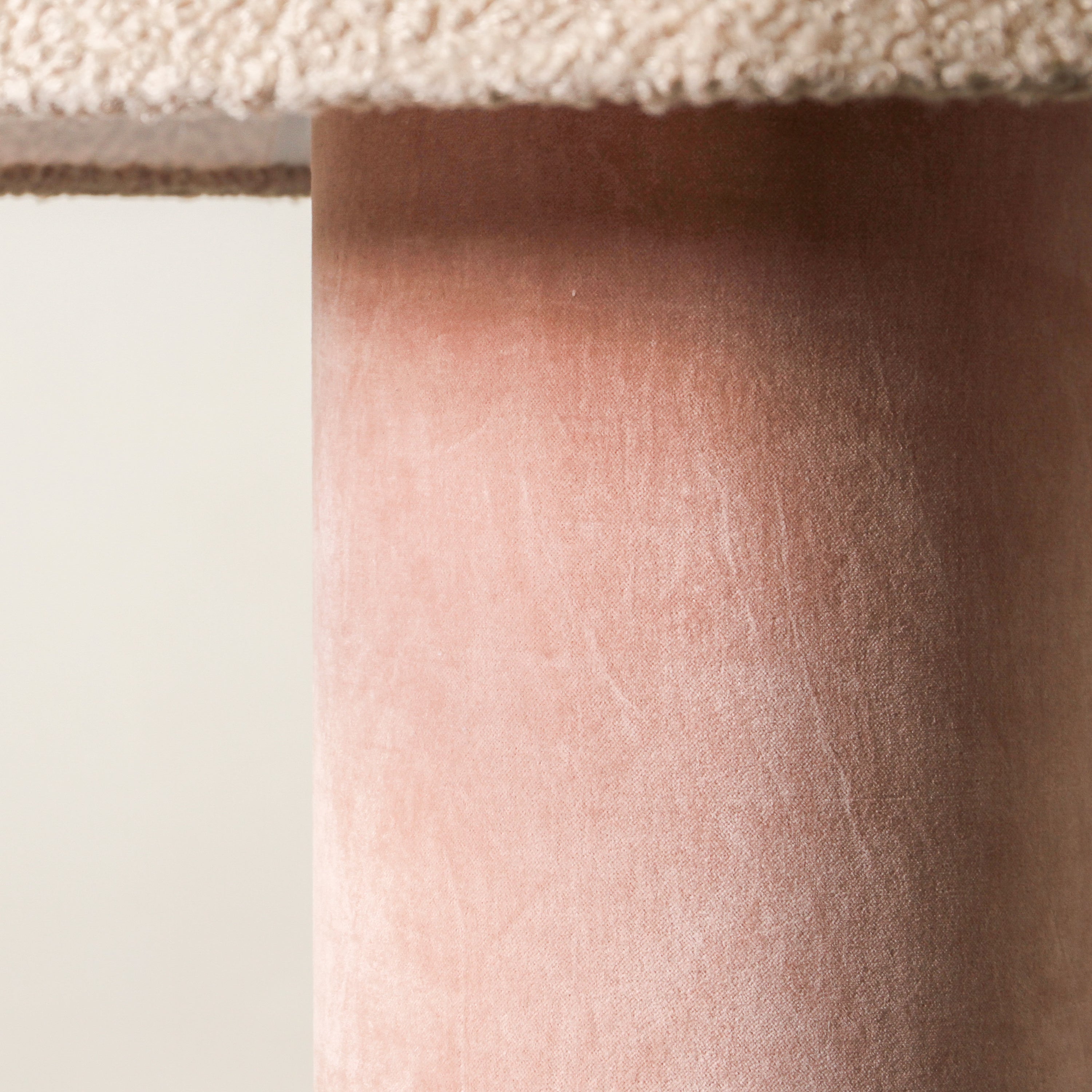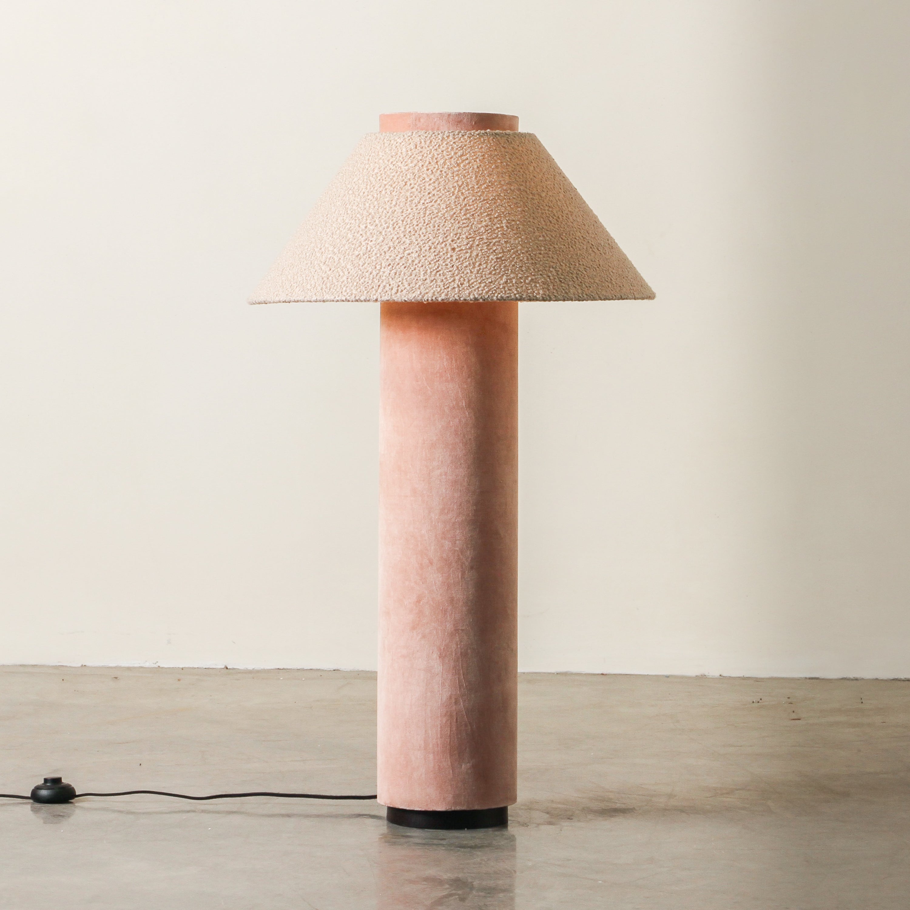 Bold yet serene, the Terrace Floor Lamp is built from contrast. A tall, cylindrical velvet base—available in Forest Green or Rose Dust—is paired with a tapered, boucle-textured shade in warm beige. The base offers rich, saturated colour and grounding weight, while the shade softens the silhouette with a tactile, organic edge. This piece embodies the vision of Tender Forms—functional design that behaves like sculpture. Terrace serves not just as lighting, but as a visual pillar within the room. Best positioned in corners, beside sofas or armchairs where height is needed. Style with low, textural furniture, and neutral materials like velvet, oak, or ceramic to allow the lamp’s form to anchor the space with intention.