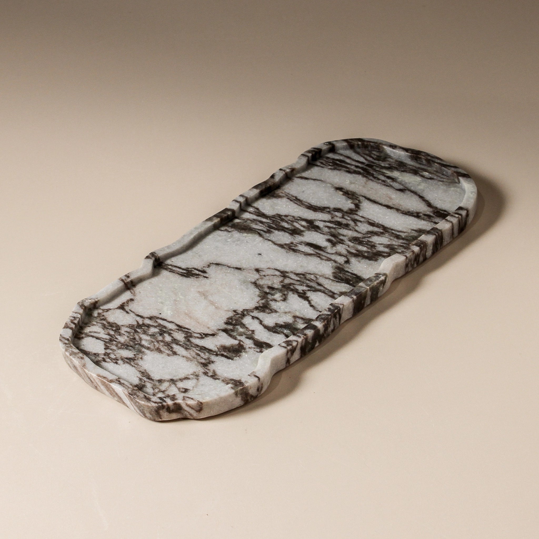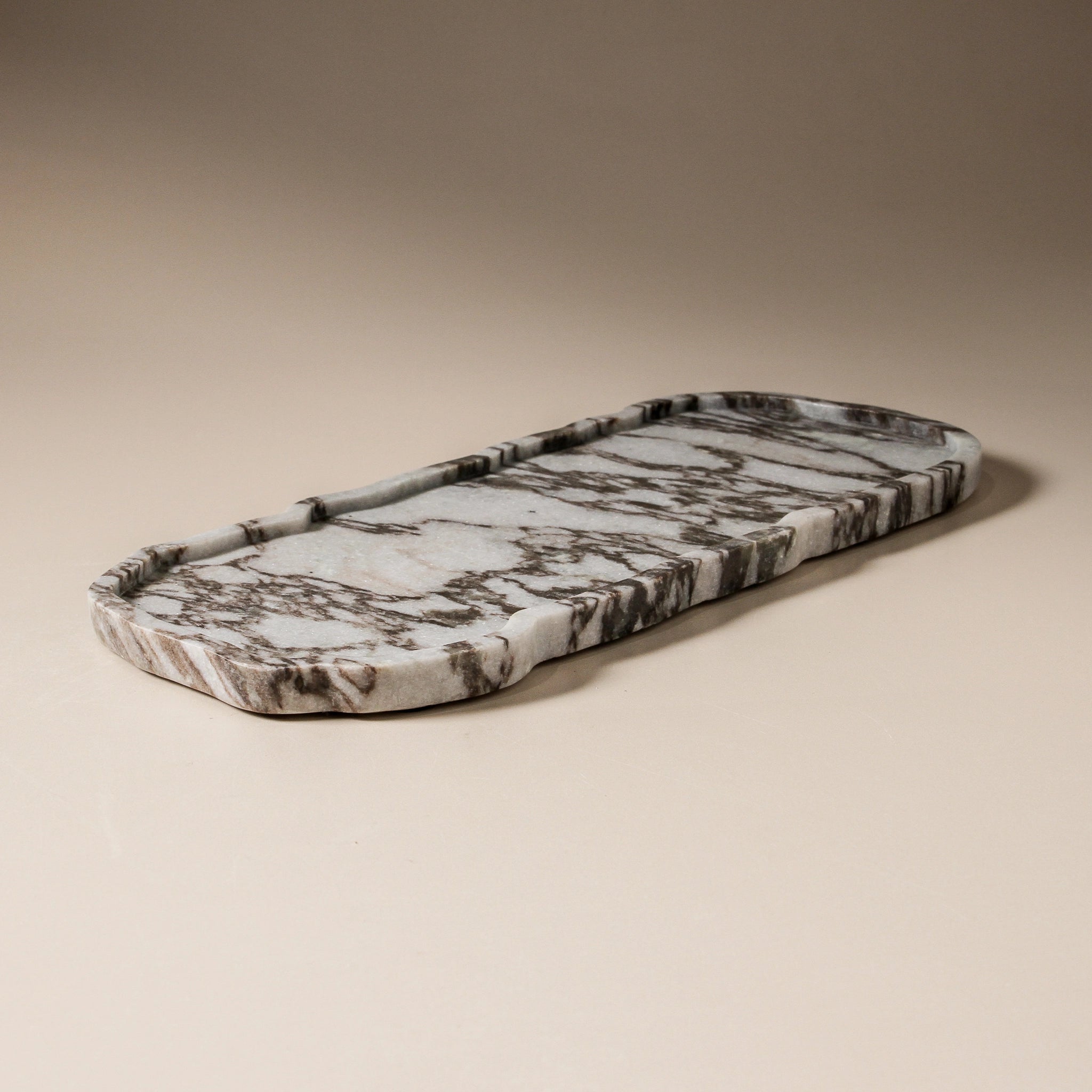 Inspired by the ebb and flow of coastal landscapes, the Tide Tray reveals layered veining reminiscent of shoreline patterns. Formed from Beige Arabescato marble, this piece captures a sense of natural rhythm — equally at home by a sunlit sink or on a curated console.