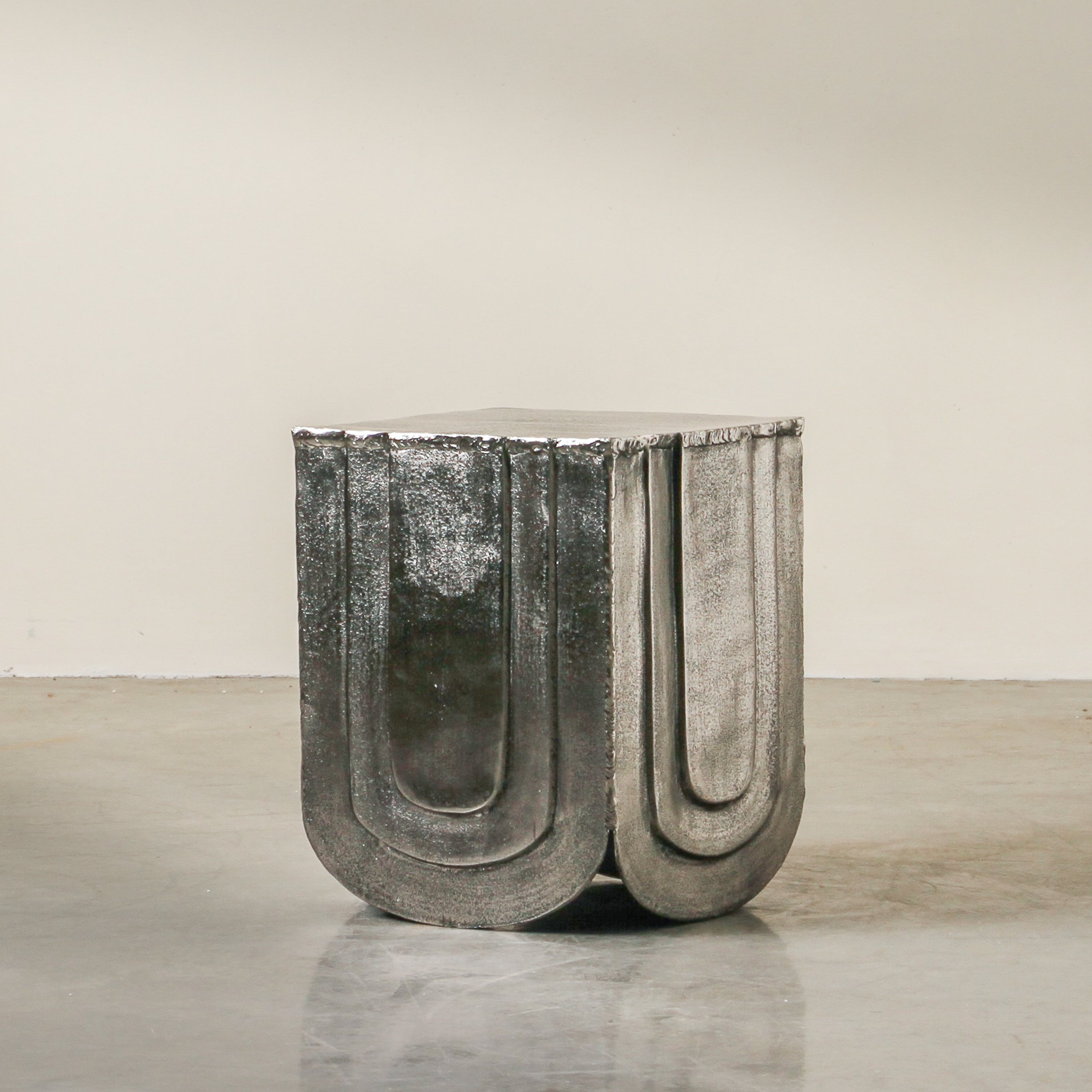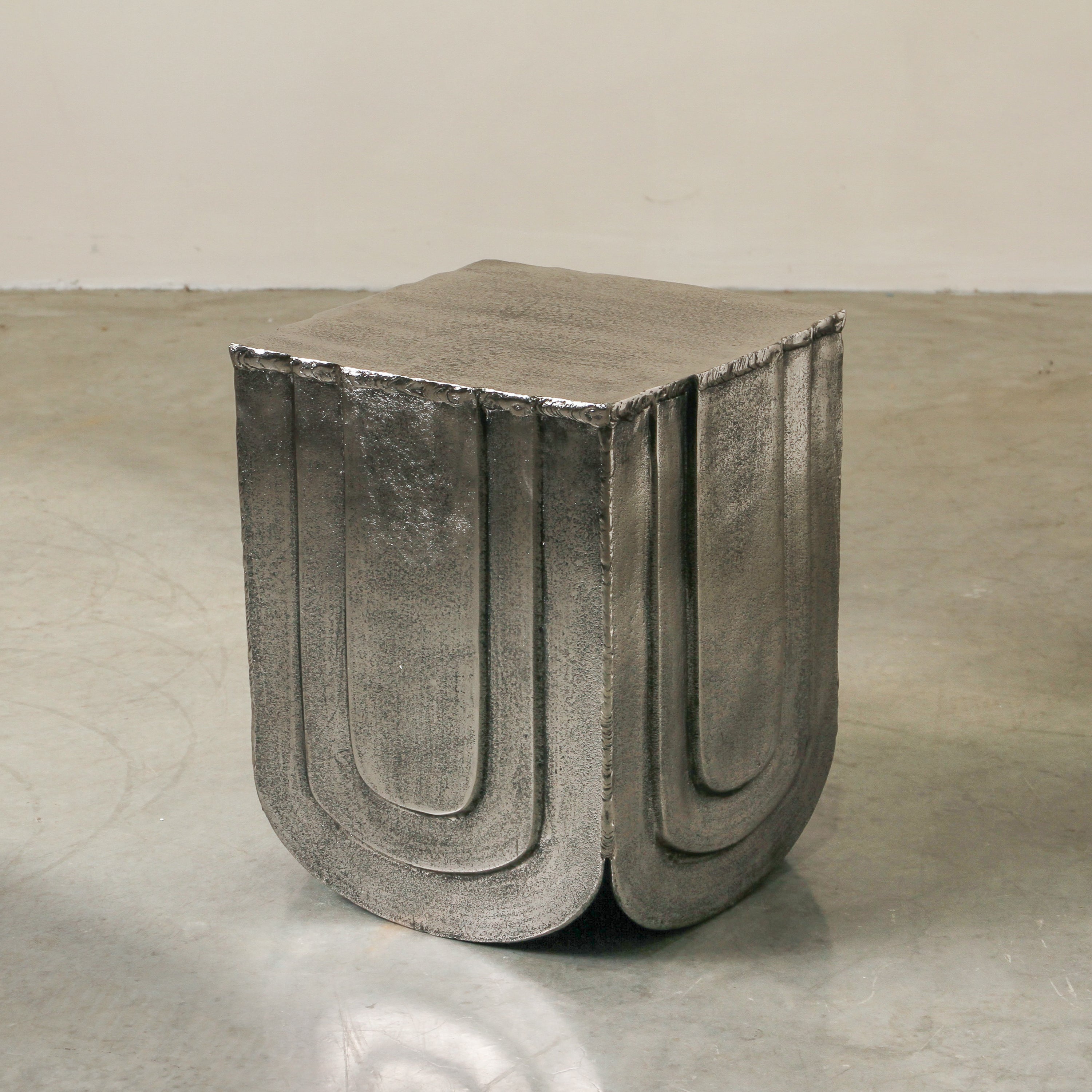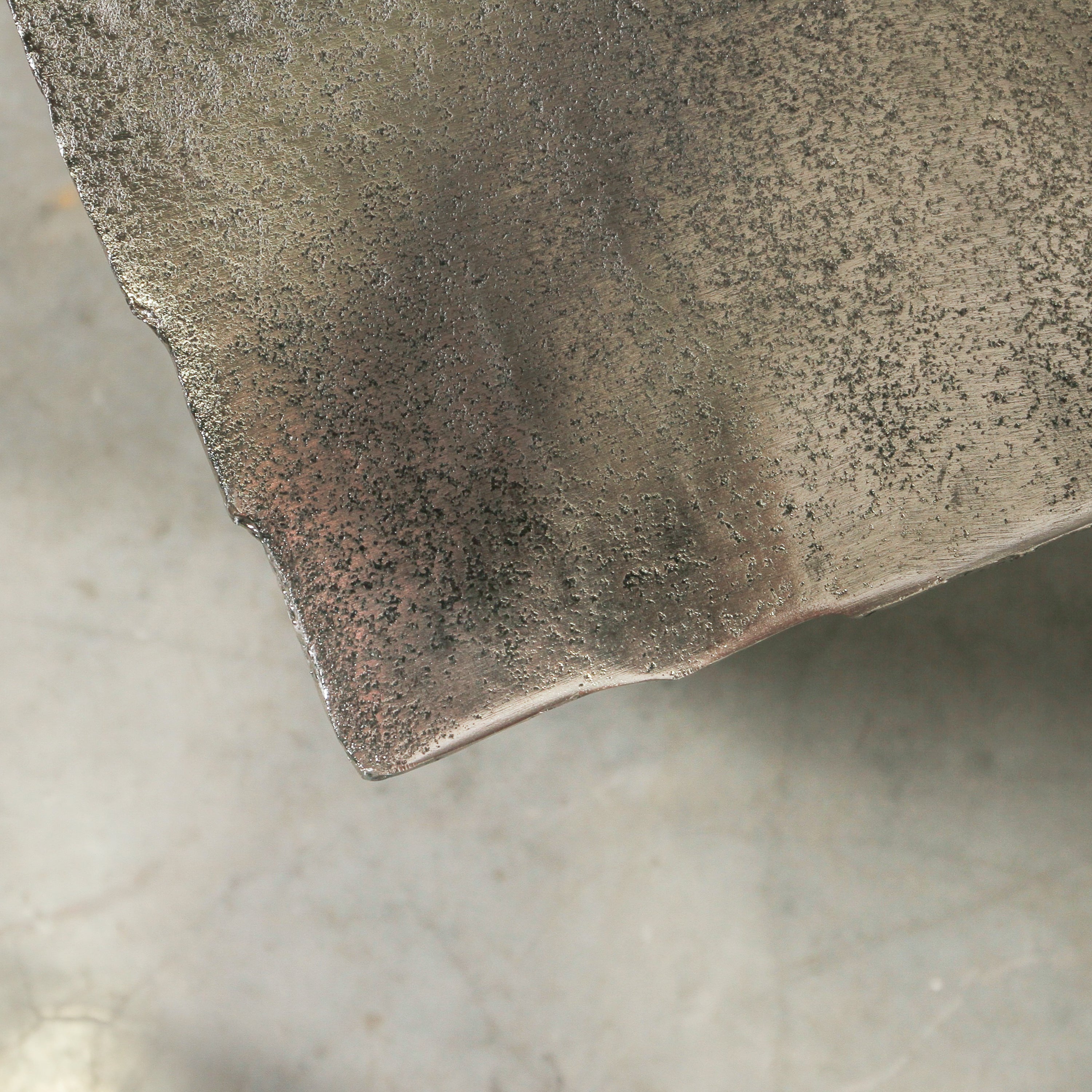 A quiet study in contrast and curve, the Vesper Side Table draws from classical motifs—its base shaped like an inverted arch, soft and grounded, lifting toward a sculptural square top. The finish is layered in antique gold with a blackened patina, giving it the timeworn depth of something unearthed, not newly made. Pair beside a sculptural lounge or float it between two occasional chairs. Let it shine with minimal styling—a single ceramic vessel or a stacked book with a natural stone object is all it needs.