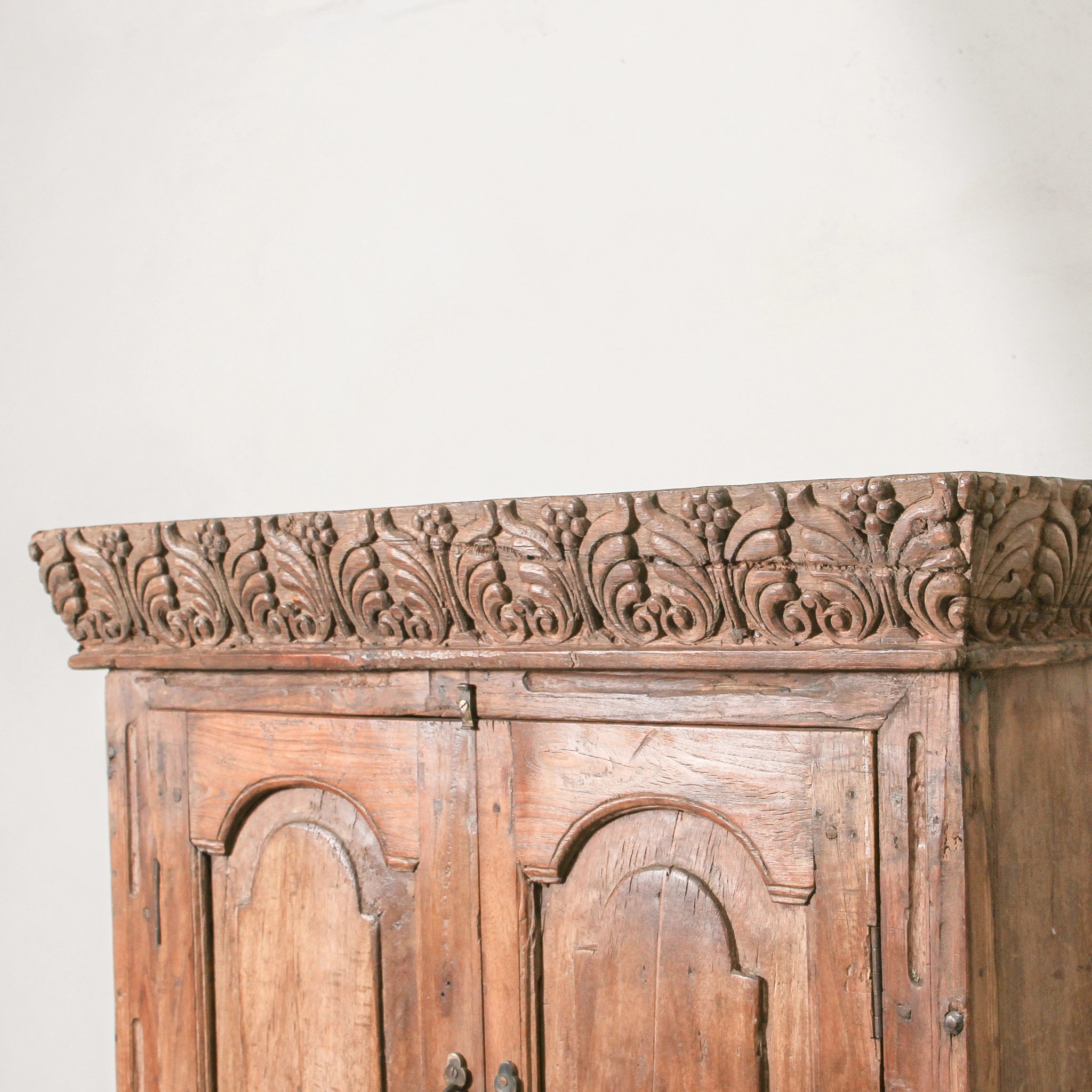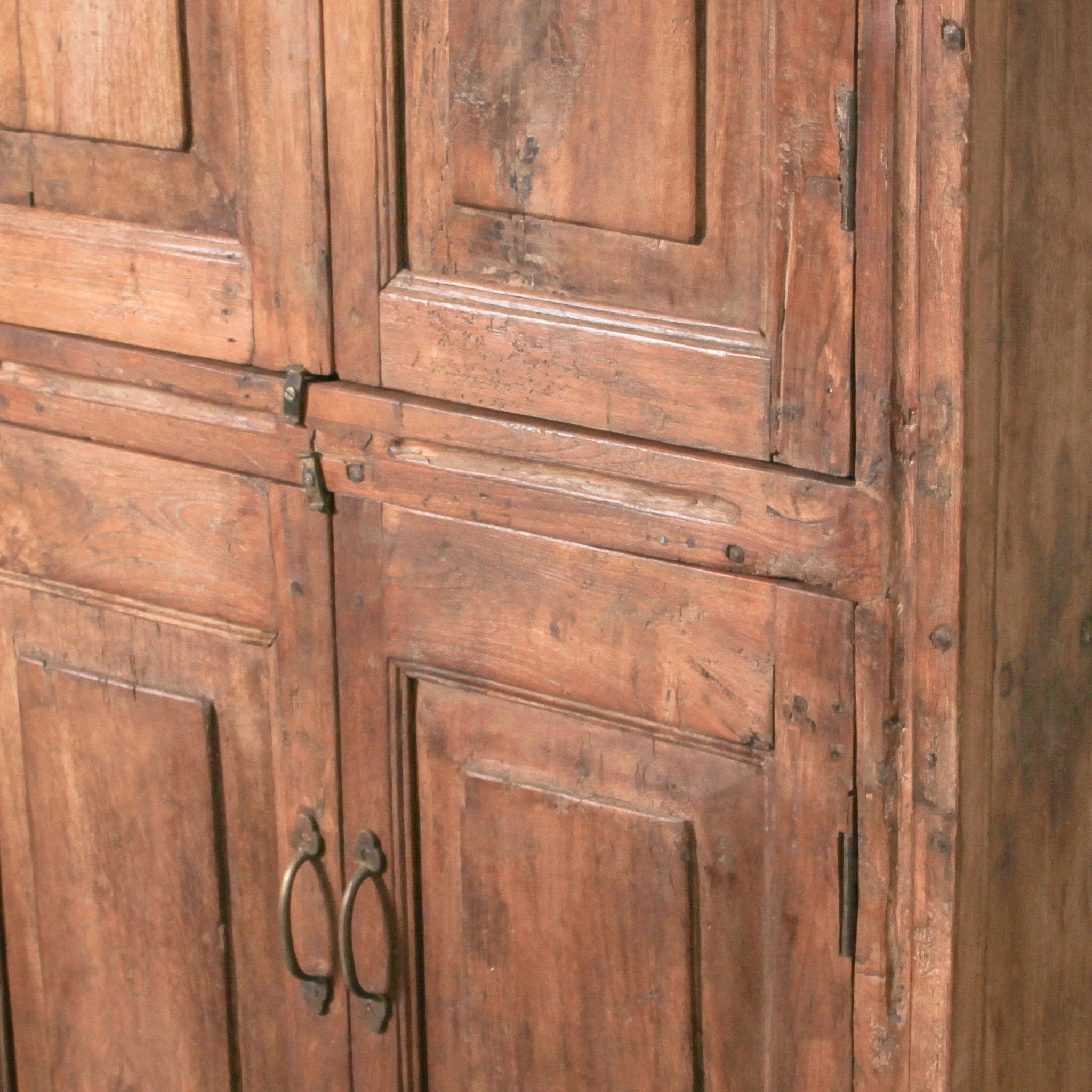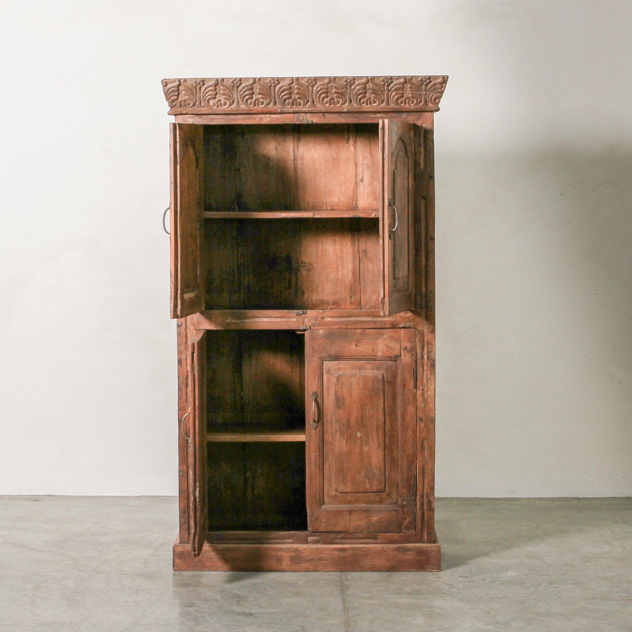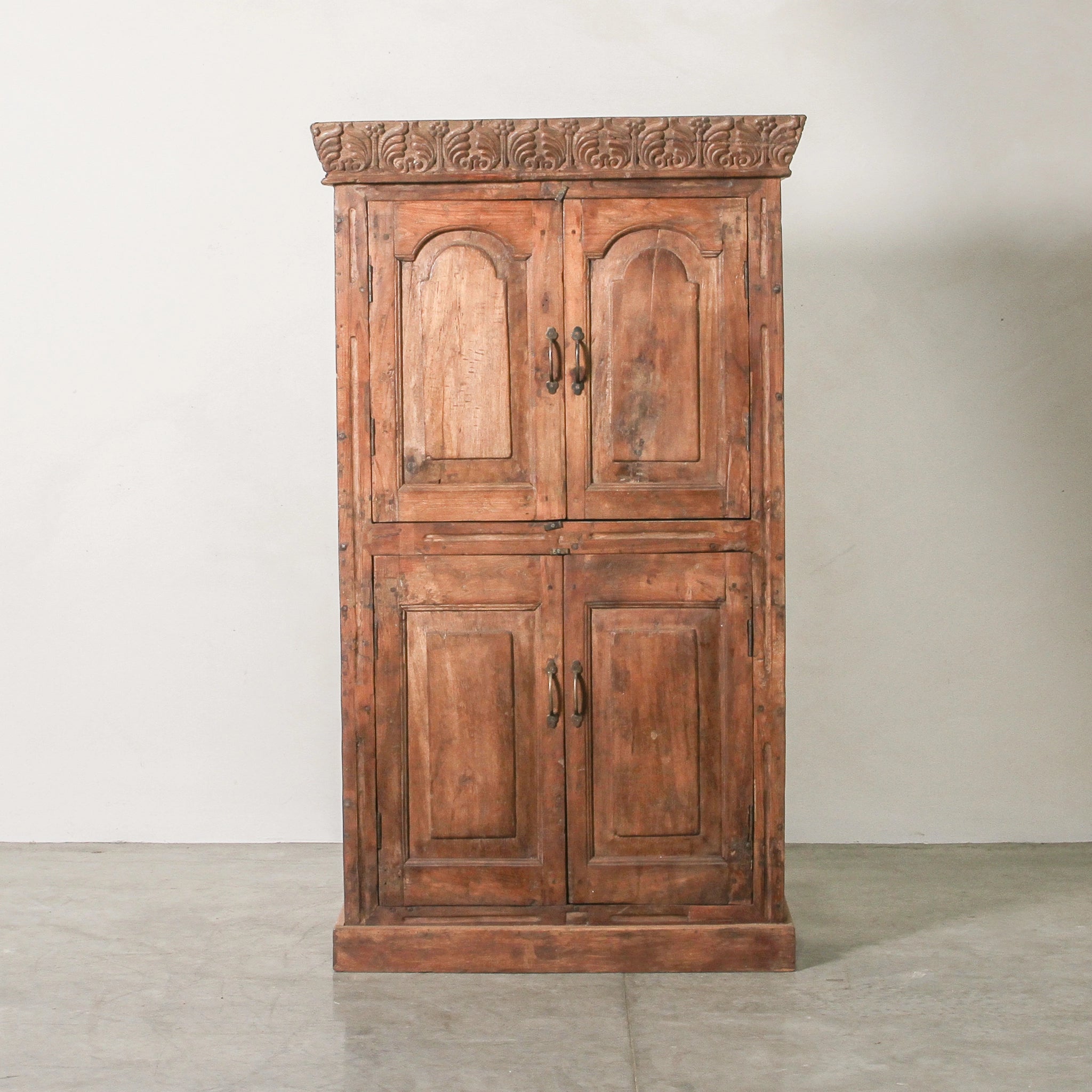 Infused with warmth and tradition, this vintage Indian almirah is crafted from solid teak and finished with a natural wax that highlights its patina. Carrying 60–80 years of Rajasthani heritage, it retains its original fittings and timeworn surface, offering both cultural depth and practical function. With its mid-scale proportions, it works beautifully in bedrooms, living spaces, or hallways as a versatile storage piece.