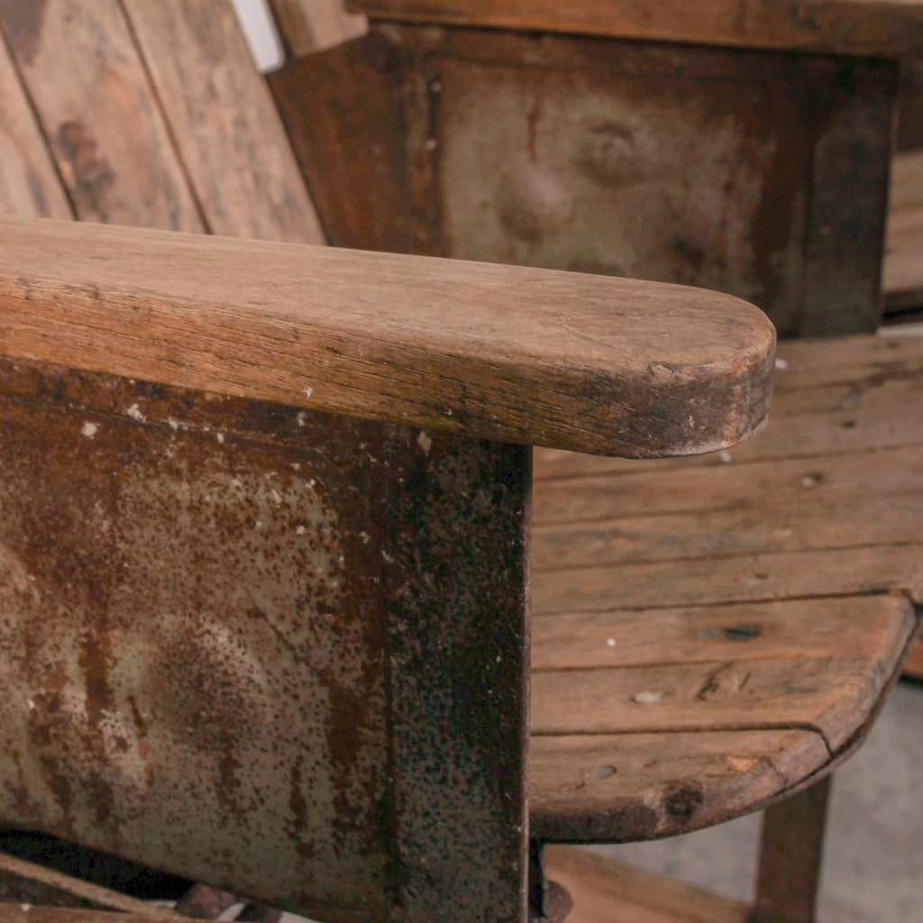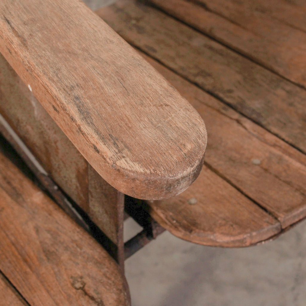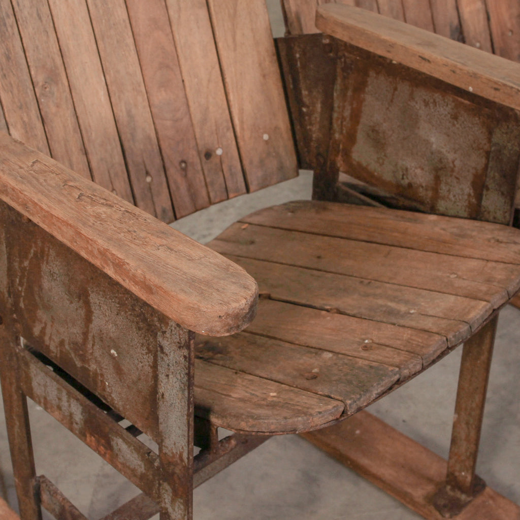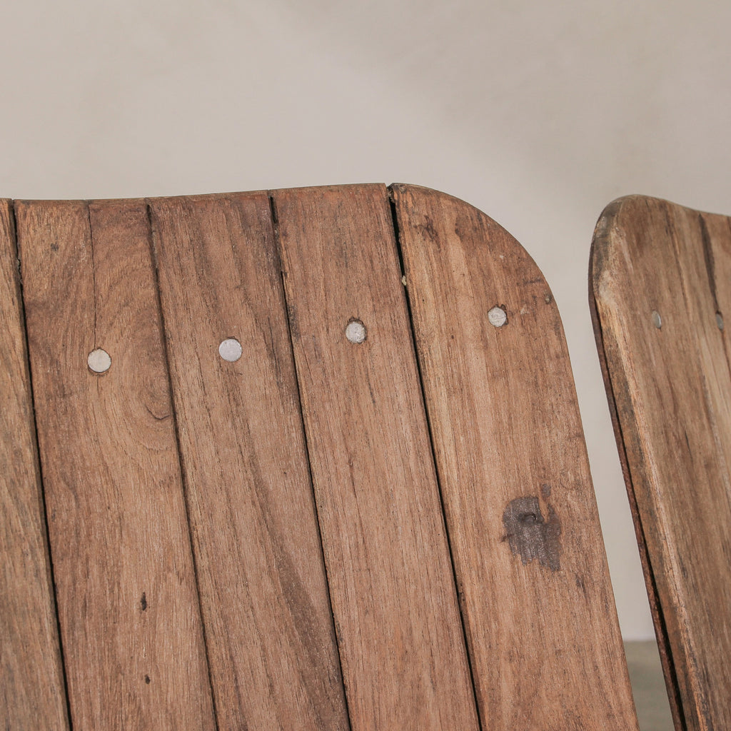 Each seat retains its natural finish, revealing the beautiful grain and patina of aged teak. With its distinctive connected design and gently worn surfaces, it tells a story of decades of use and craftsmanship.