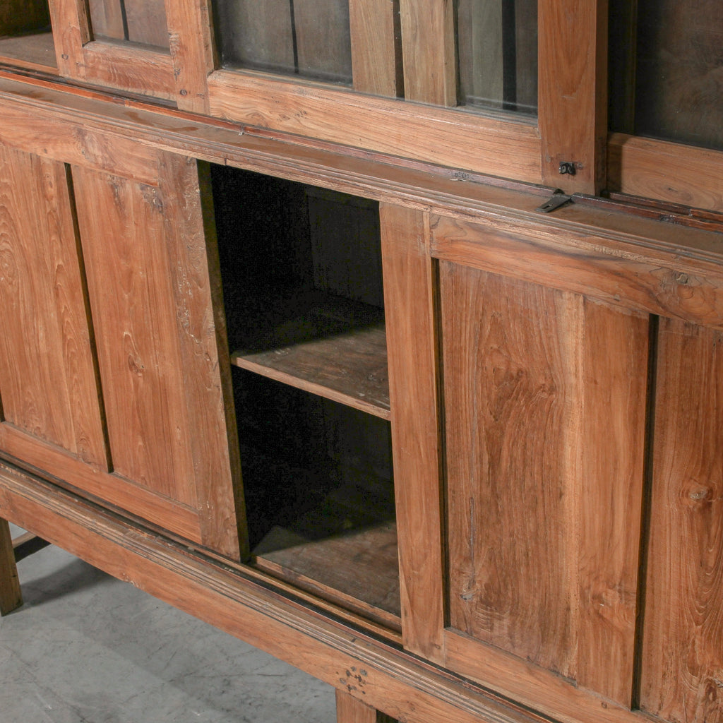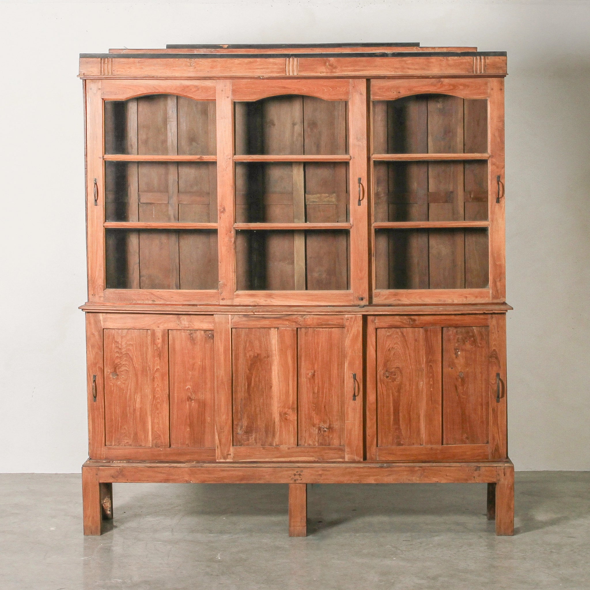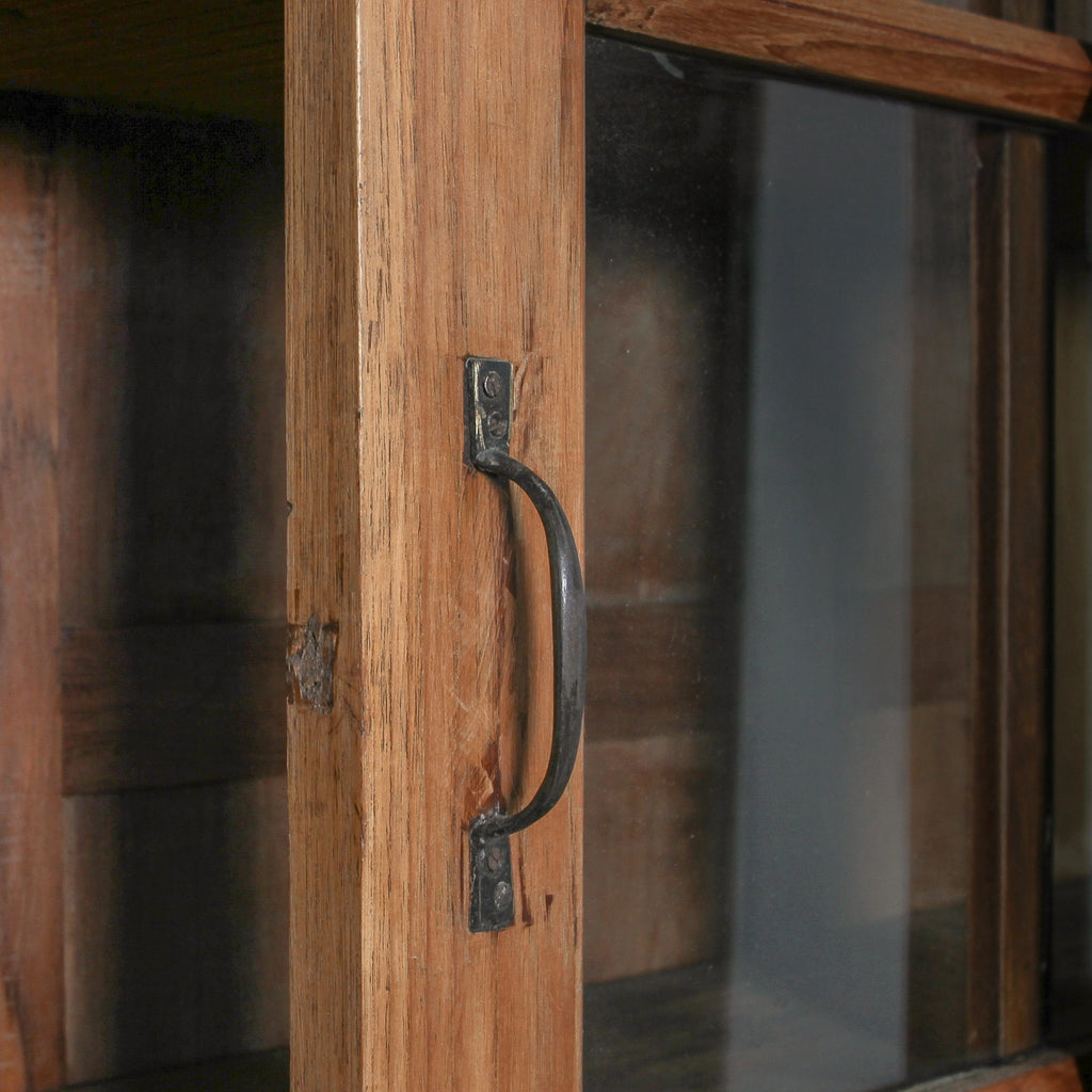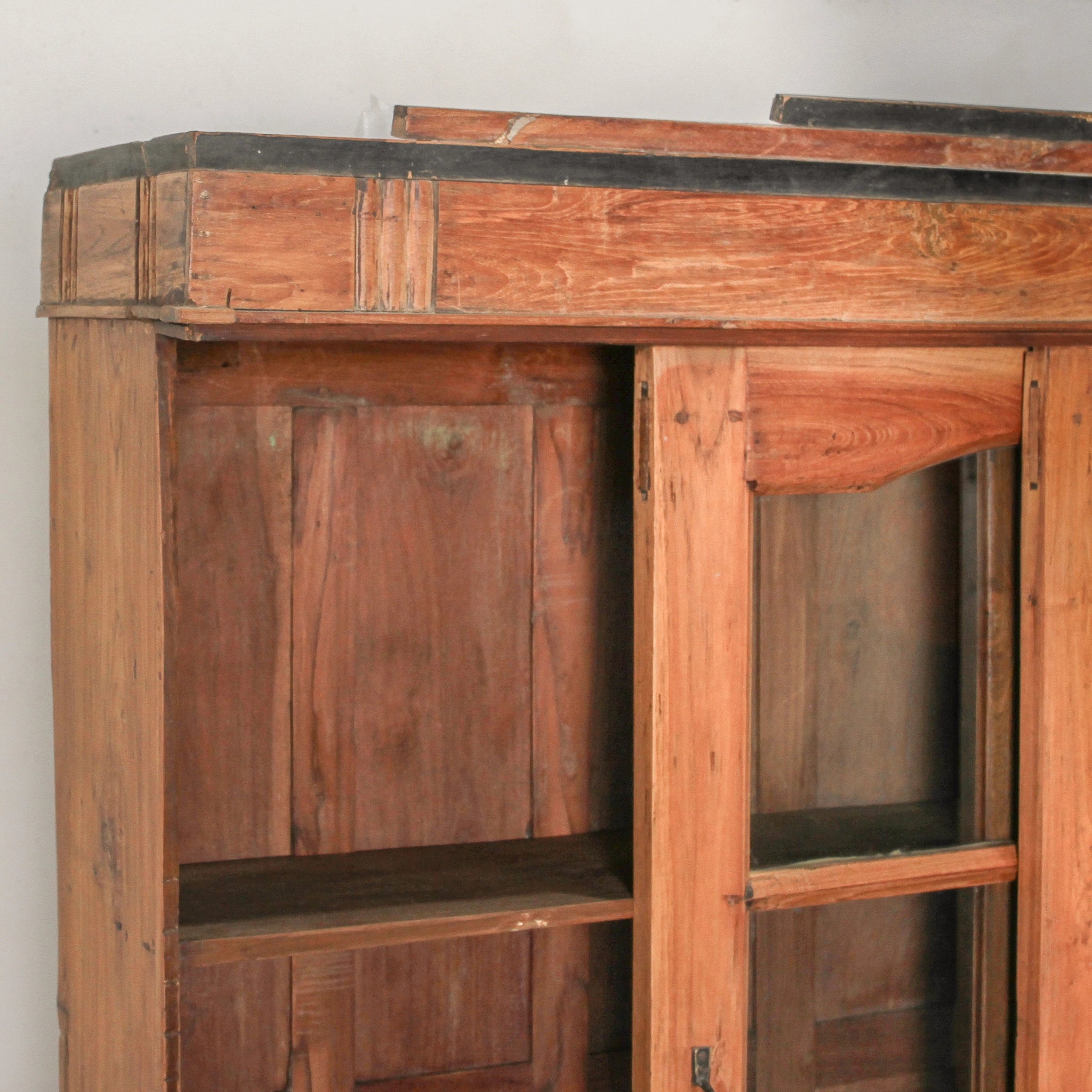 Steeped in heritage and craftsmanship, this grand vintage Indian glass almirah is handcrafted from solid teak and finished with a natural wax that enriches its patina. Towering in scale with glass-panelled doors, it offers both display and storage, while its 60–80 years of Rajasthani history add authenticity and cultural depth. A true statement piece, it brings presence and functionality to dining rooms, living spaces, or libraries.