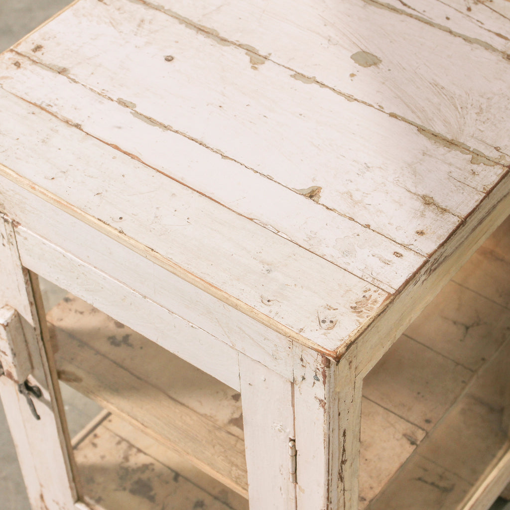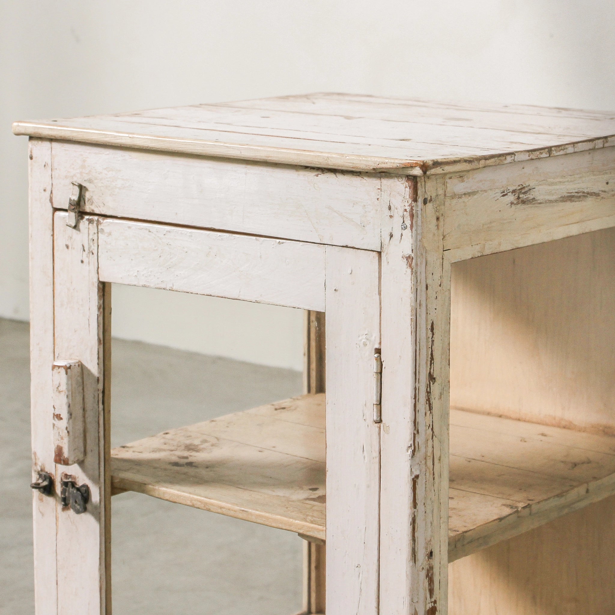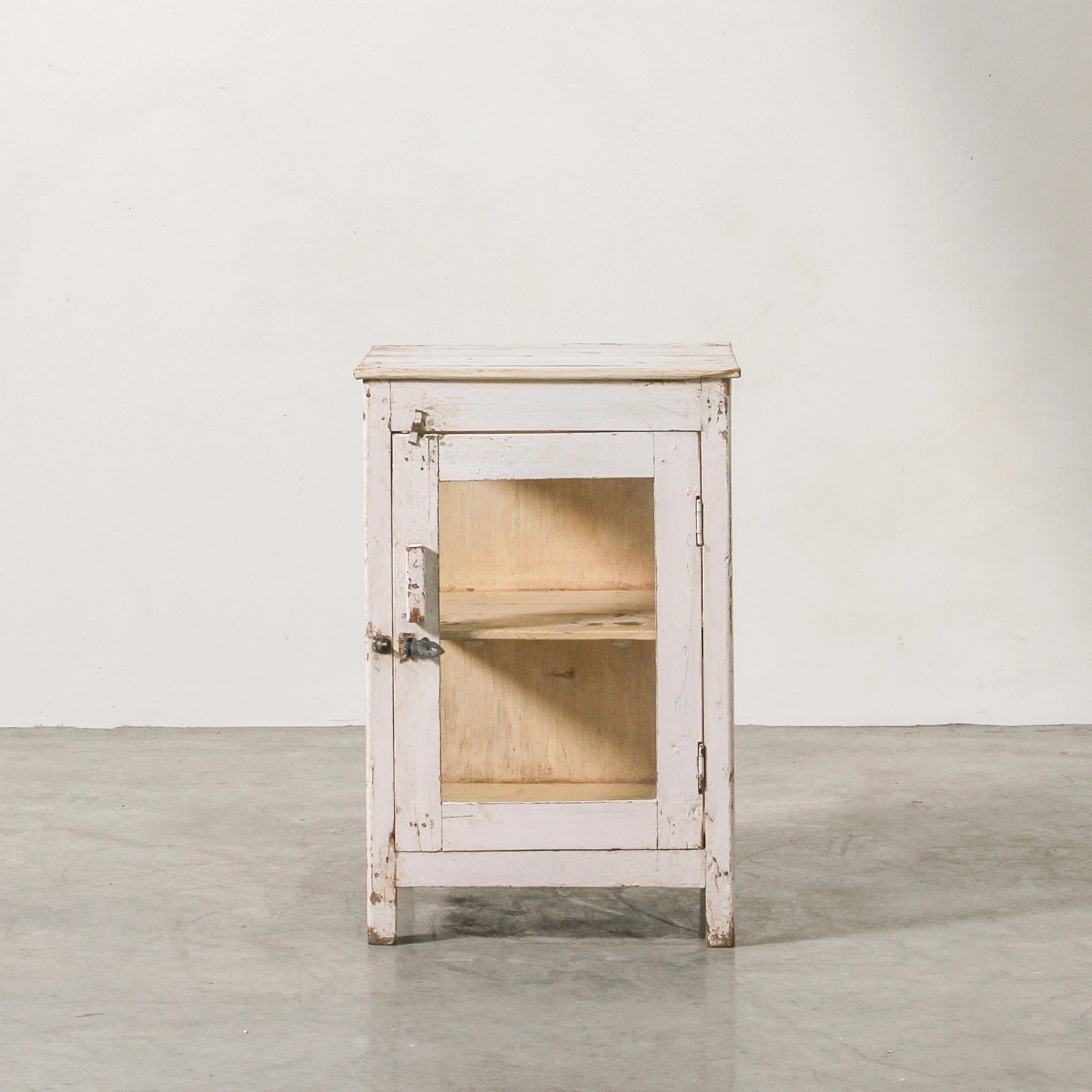 Crafted with care and time-worn beauty, this vintage Indian bedside table is made from solid teak with a natural wax finish that highlights its 60–80 years of age. With a compact form and glass-fronted door, it combines storage and display while carrying the patina and authenticity of Rajasthani craftsmanship. Perfect as a bedside companion or small accent cabinet, it layers story and practicality into any room.