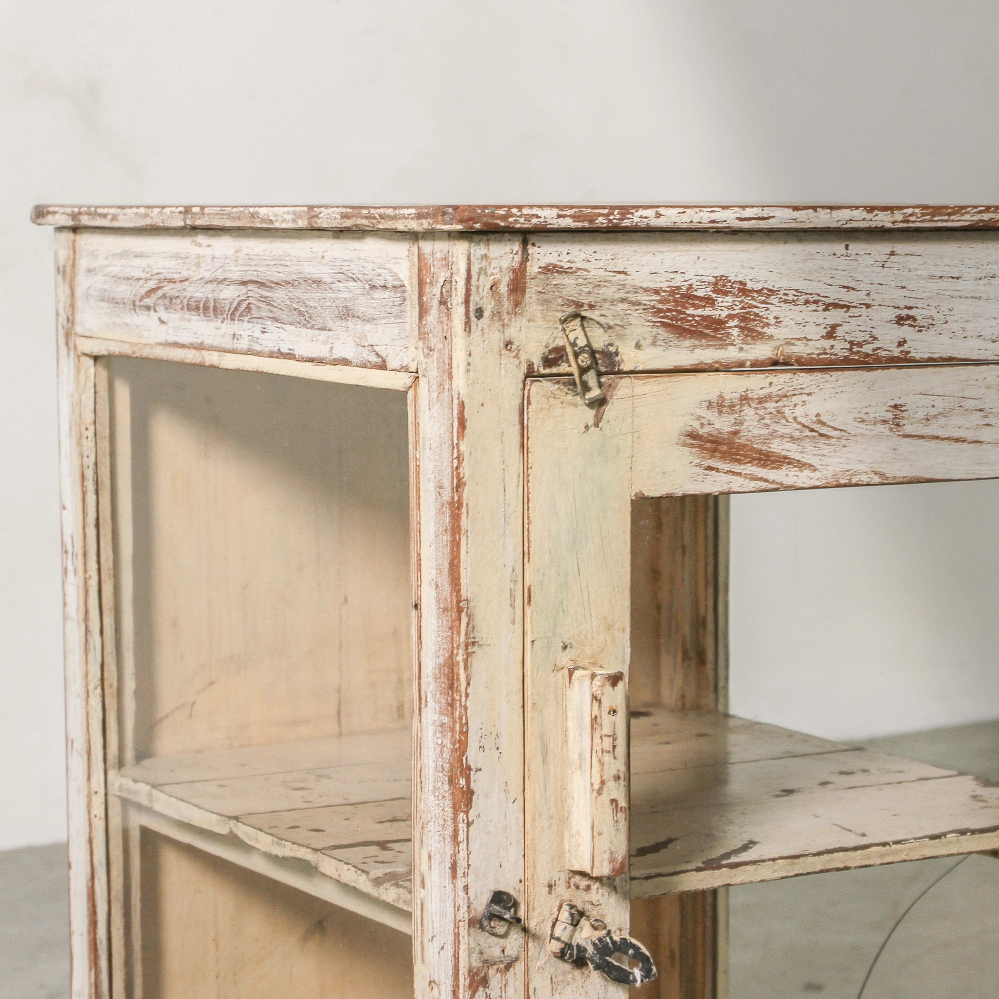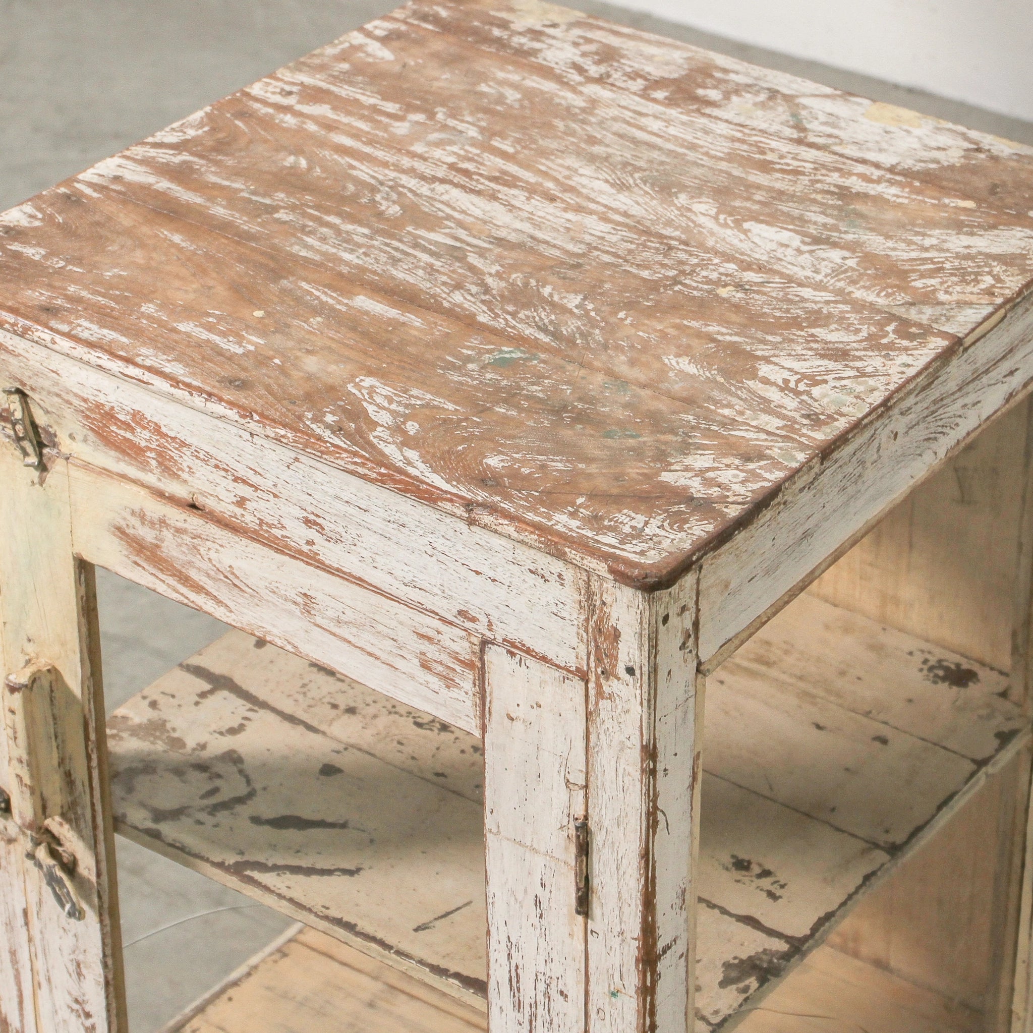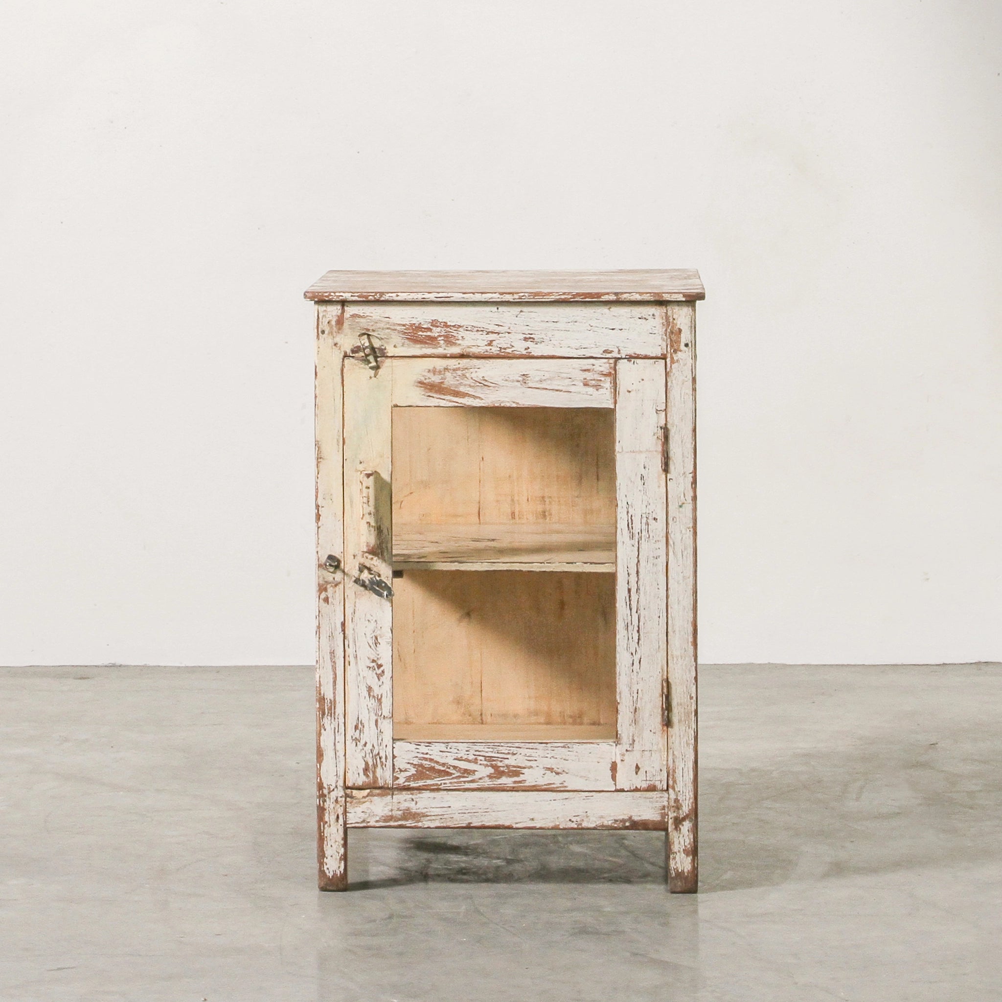 Crafted with care and time-worn beauty, this vintage Indian bedside table is made from solid teak with a natural wax finish that highlights its 60–80 years of age. With a compact form and glass-fronted door, it combines storage and display while carrying the patina and authenticity of Rajasthani craftsmanship. Perfect as a bedside companion or small accent cabinet, it layers story and practicality into any room.