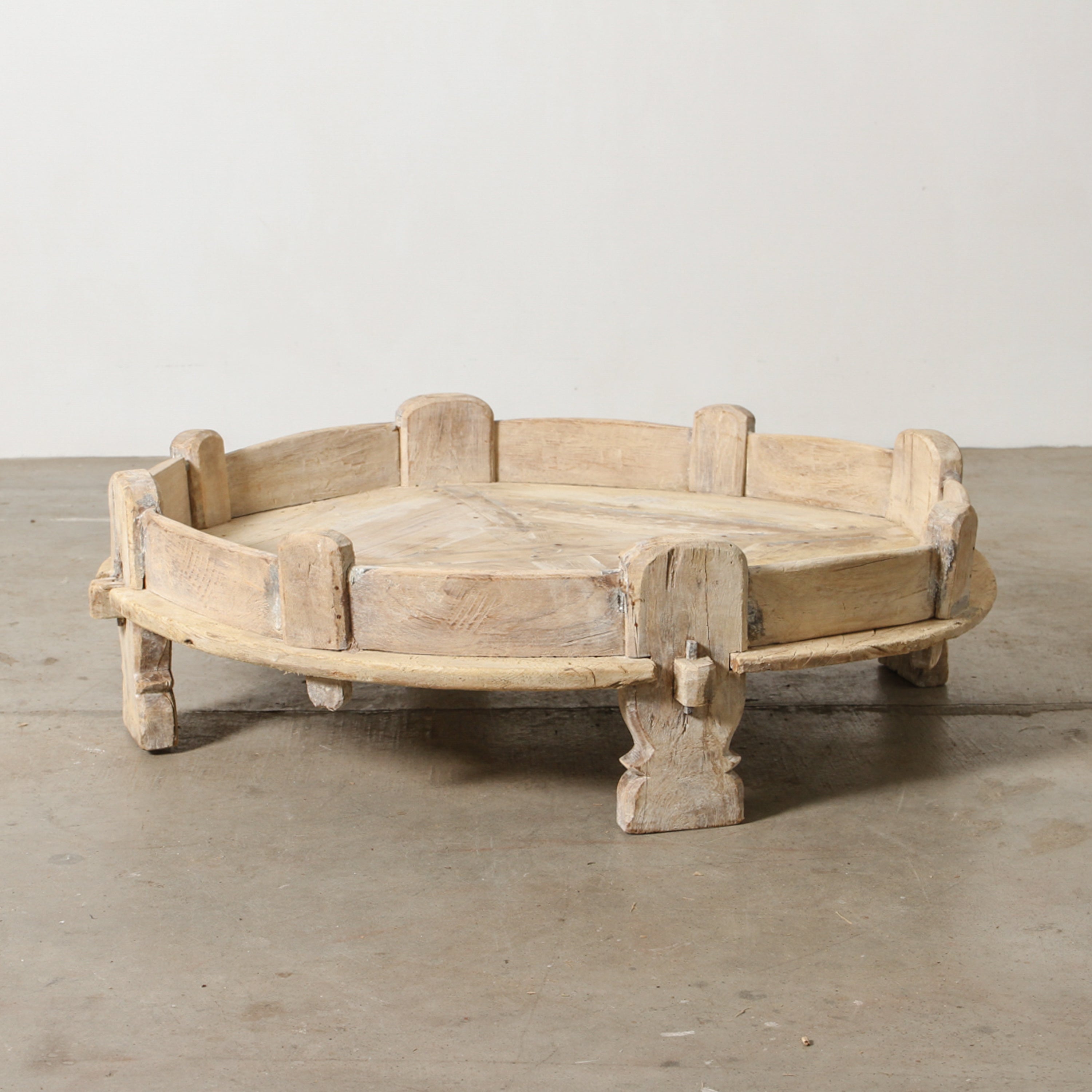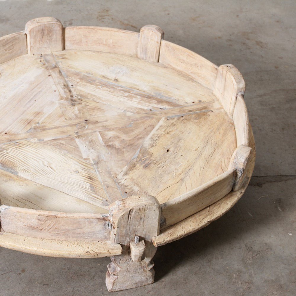Traditional Northern Indian chakki grinder tables are treasures that we return to season after season. They were used in Indian havelis to grind grain into chakki atta flour to make chipati or roti bread for the whole family. Each table is over 60 years old and has been crafted from solid teak that has been intricately hand carved. Sometimes, these tables still have original iron hardware and strapwork intact. The beautiful carvings will differ from one chakki grinder to the next as these items were unique to each household and each family.