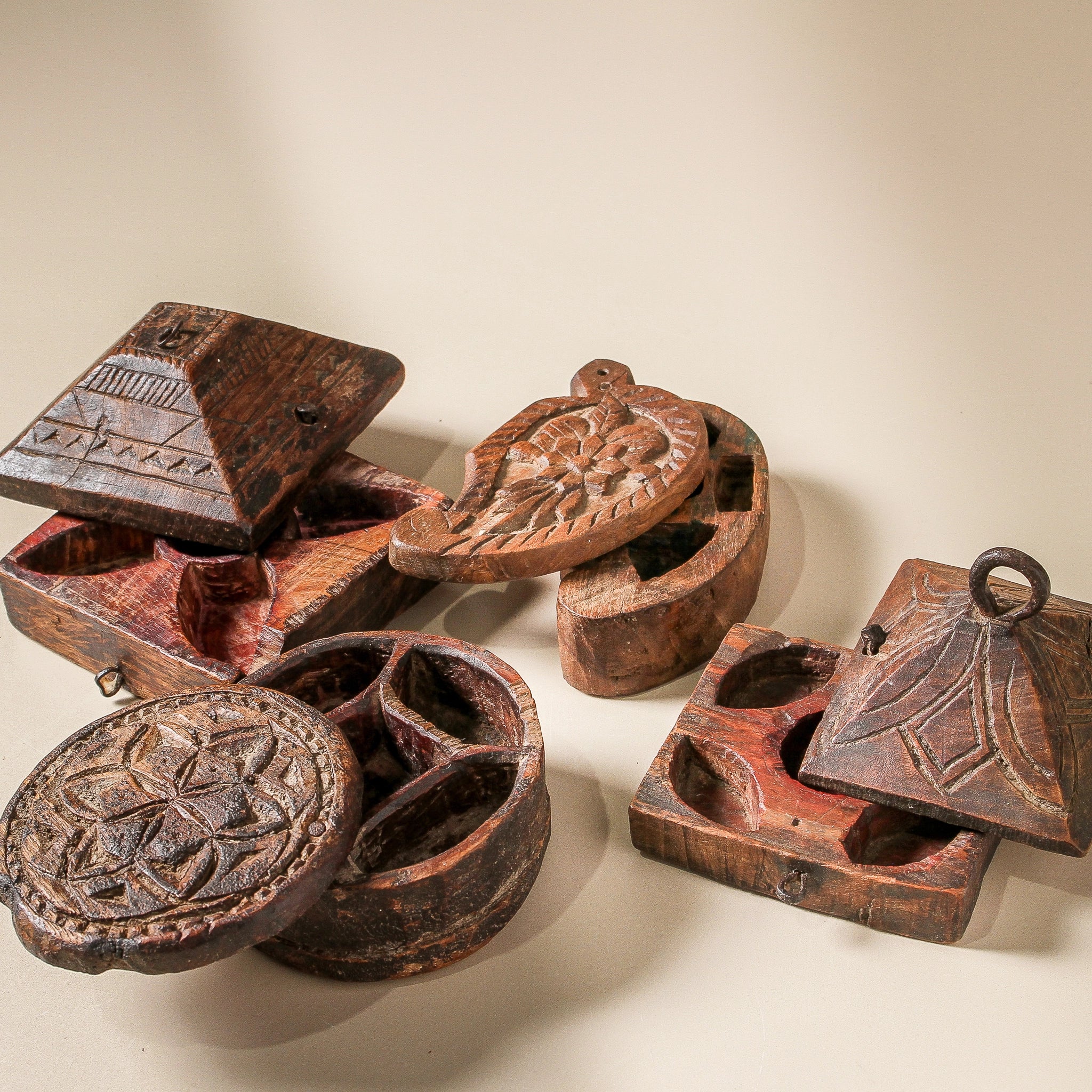 Infused with warmth and tradition, this vintage Indian spice box is hand-carved from solid teak and finished with a natural wax that enhances its aged character. Used in Rajasthani kitchens 60–80 years ago, it once held everyday spices and now serves as a charming decorative accent. Its compact form makes it perfect for styling on shelves, coffee tables, or as a small catch-all with heritage appeal.