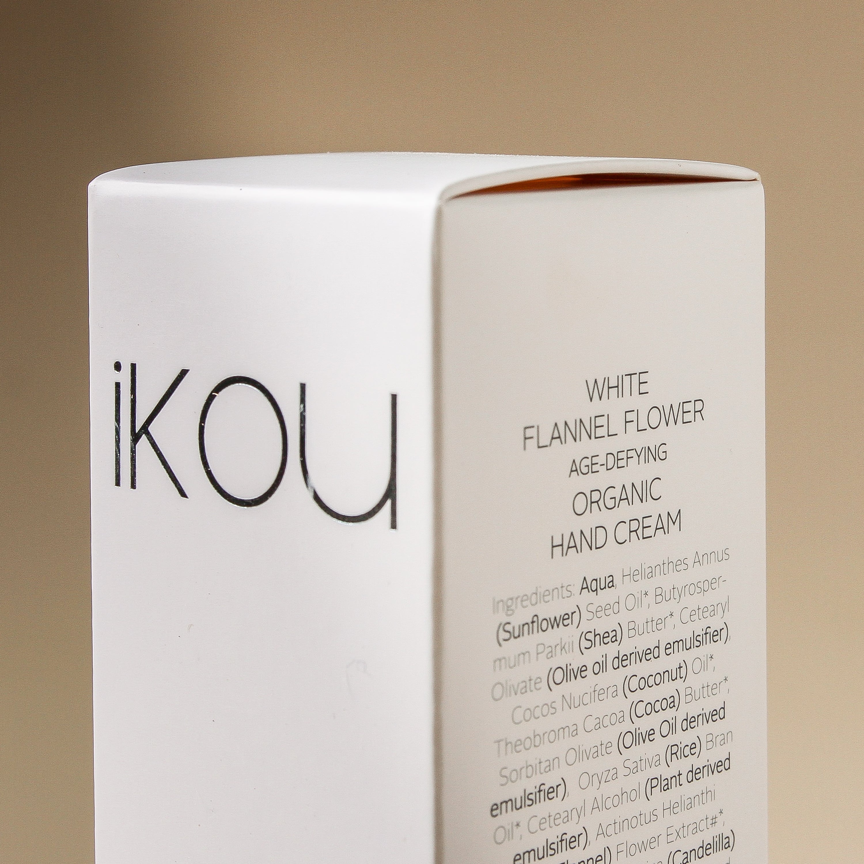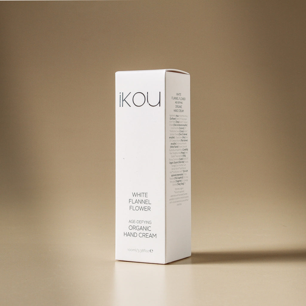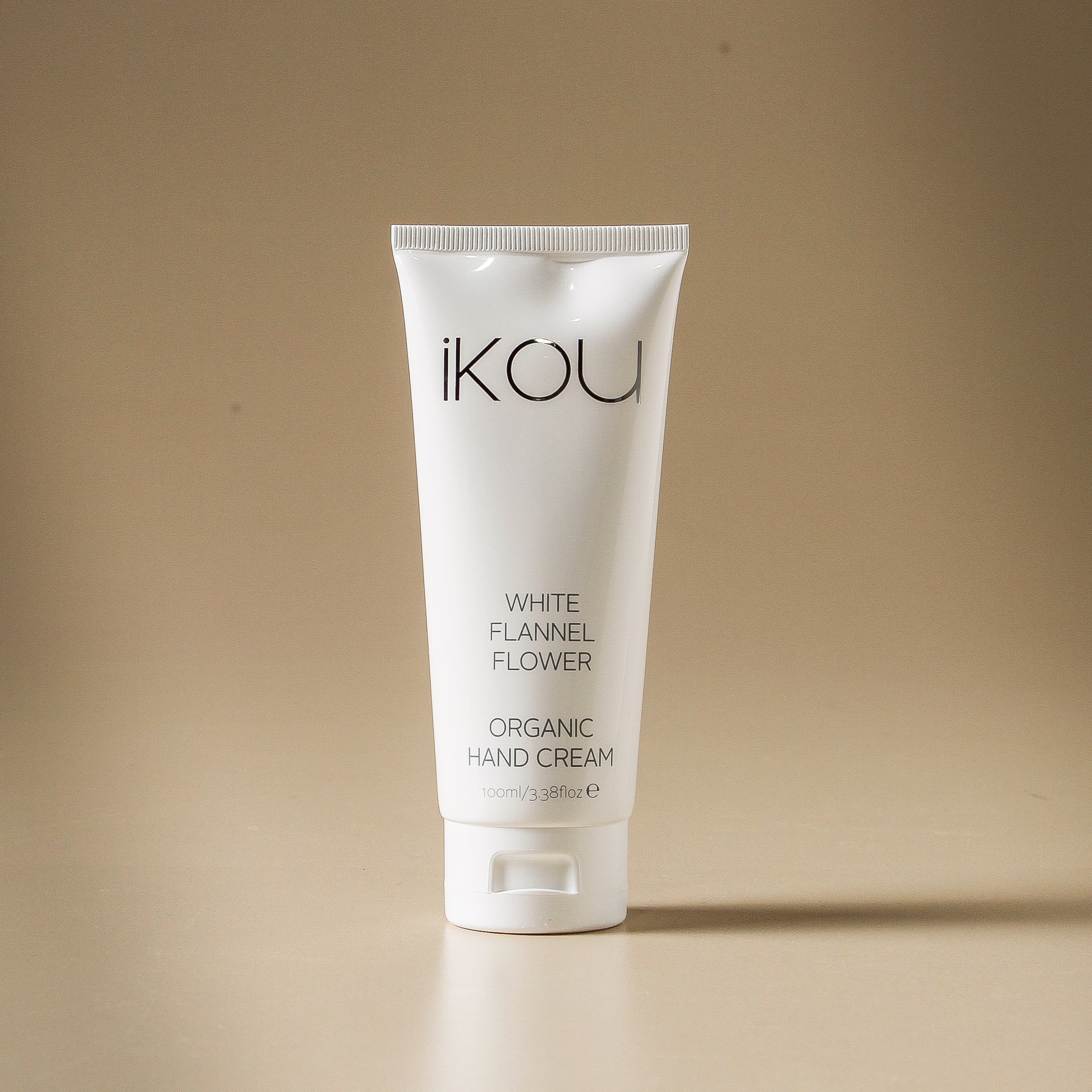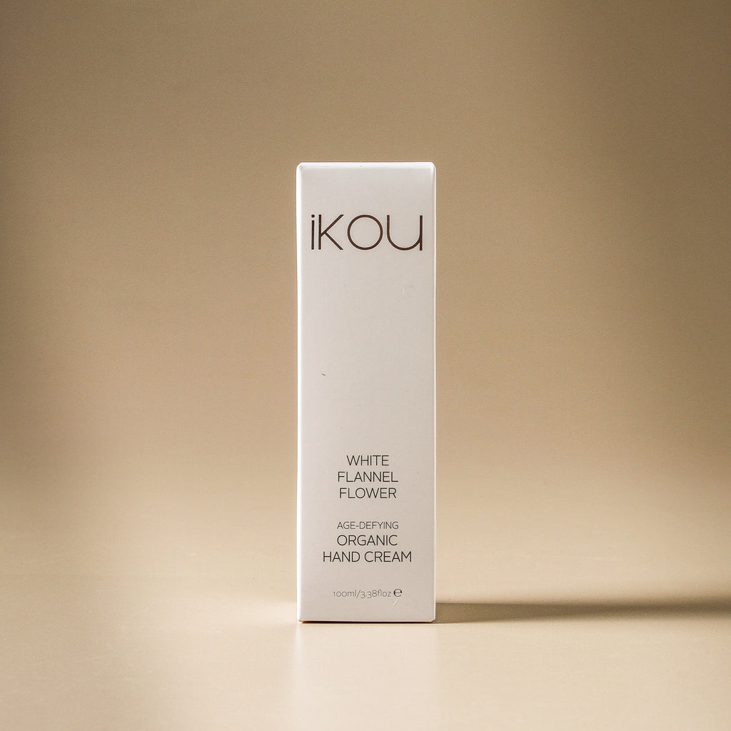 The iKOU White Flannel Flower Organic Hand Cream blends age-defying Australian White Flannel Flower with a triple-butter complex and antioxidant-rich botanicals, delivering breathable hydration, improved skin elasticity, and a luxuriously soft, delicately scented finish.