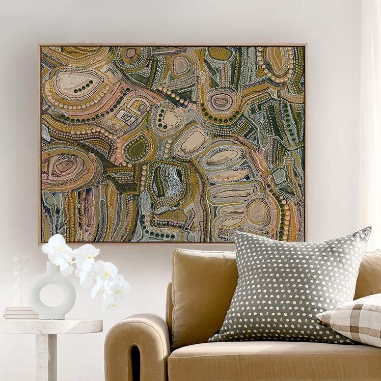 Breathtakingly intricate, this contemporary Indigenous Aboriginal artwork piece by artist Amanda Hinkelmann highlights the importance of The Dreaming stories in the passing down of lessons and messages in Indigenous Aboriginal culture. Featuring myriads of paths, shapes and patterns, this captivating artwork shows its connection to Mother Earth by use of a warm, muted and earthy colour palette of moss green, beige, mustard and peach tones. This is the sister piece to Marramarra.